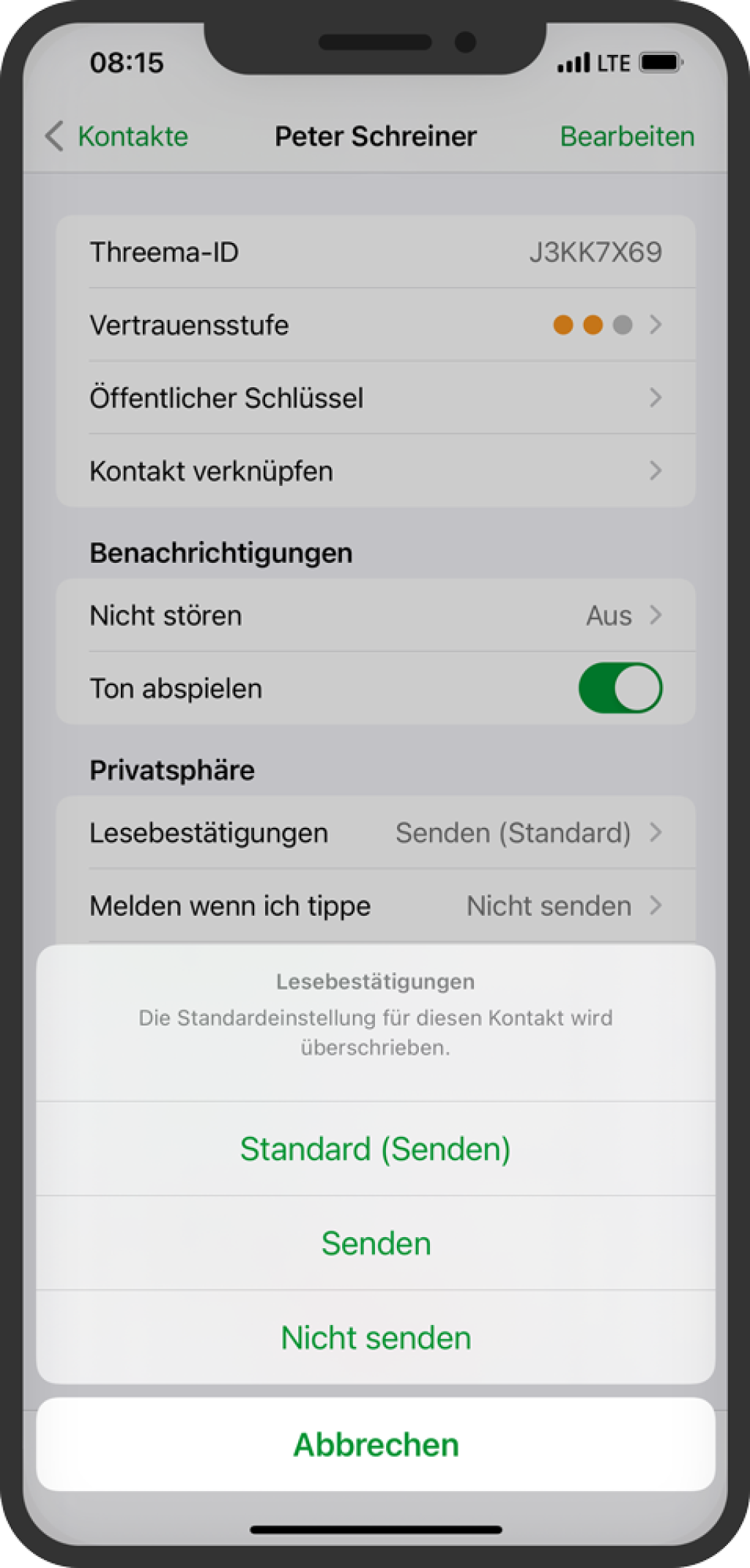 Die Lesebestätigungen- und «Melden, wenn ich tippe»-Einstellung kann nun für einzelne Kontakte angepasst werden. Gehen Sie dazu in die Kontaktdetails, und passen Sie die Einstellung bei «Lesebestätigungen» und «Melden, wenn ich tippe» an. Diese Einstellung gilt dann nur für den jeweiligen Kontakt. Ist keine kontaktspezifische Einstellung definiert, greift die globale Einstellung unter «Threema > Einstellungen > Privatsphäre > Chat».