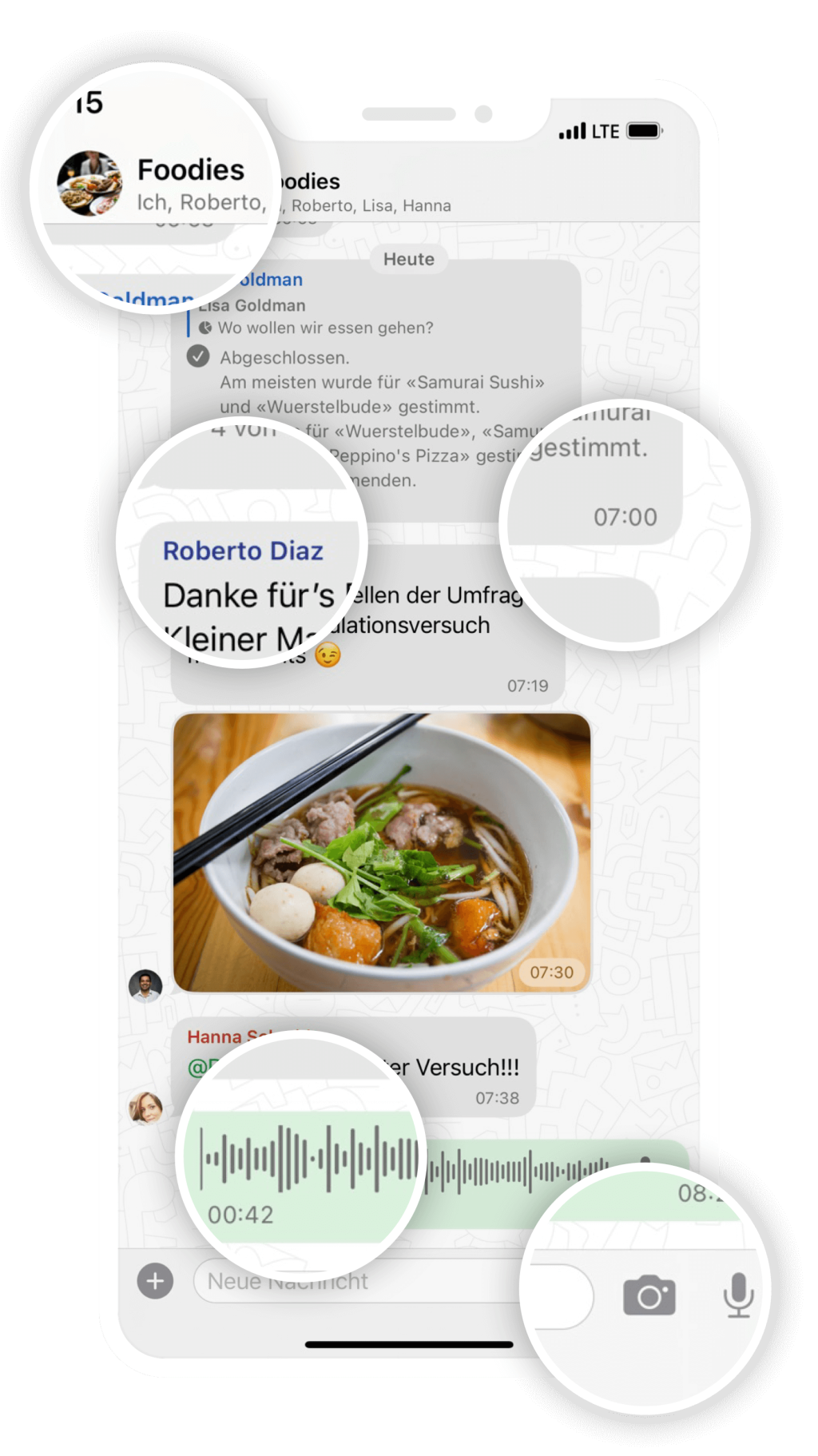 Bei Gruppennachrichten werden die Namen der Mitglieder in verschiedenen Farben dargestellt.