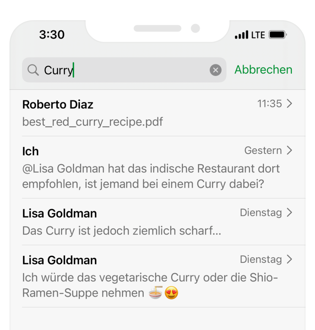 Wird im Chat nach einem Stichwort gesucht, werden neu alle Resultate in einer übersichtlichen Liste dargestellt.