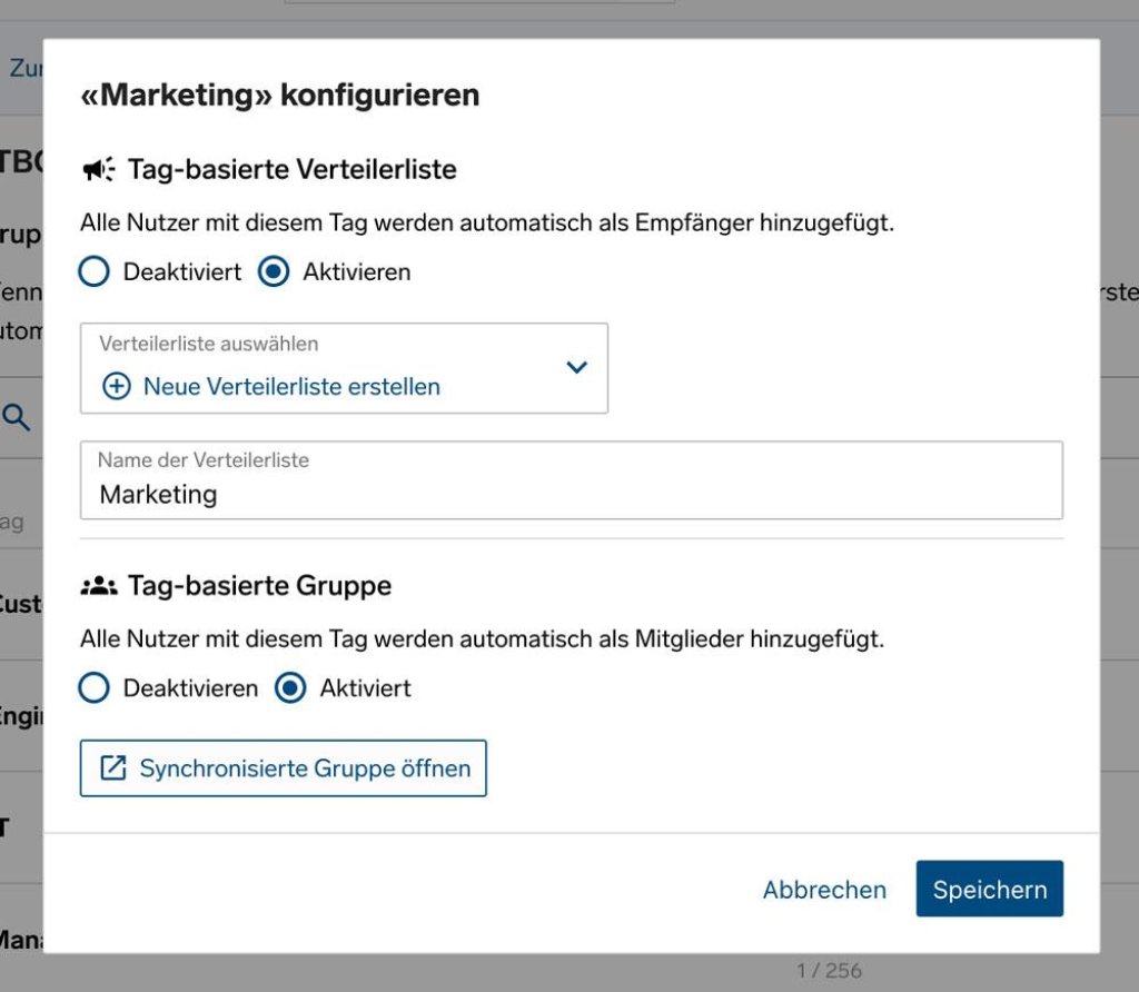 Wichtig: Synchronisieren Sie eine bestehende Verteilerliste oder Gruppe, werden alle bisherigen Nutzer entfernt, denen der entsprechende Tag nicht zugewiesen ist.