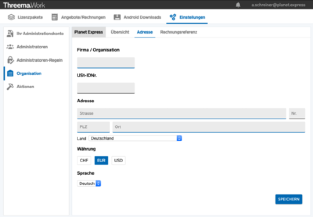 Die Rechnung enthält gemäss EU-Recht keine Umsatzsteuer, wenn Sie im Administrationskonto die Umsatzsteuer-Identifikationsnummer (USt-IdNr.) Ihrer juristischen Person hinterlegen oder nachträglich ergänzen: