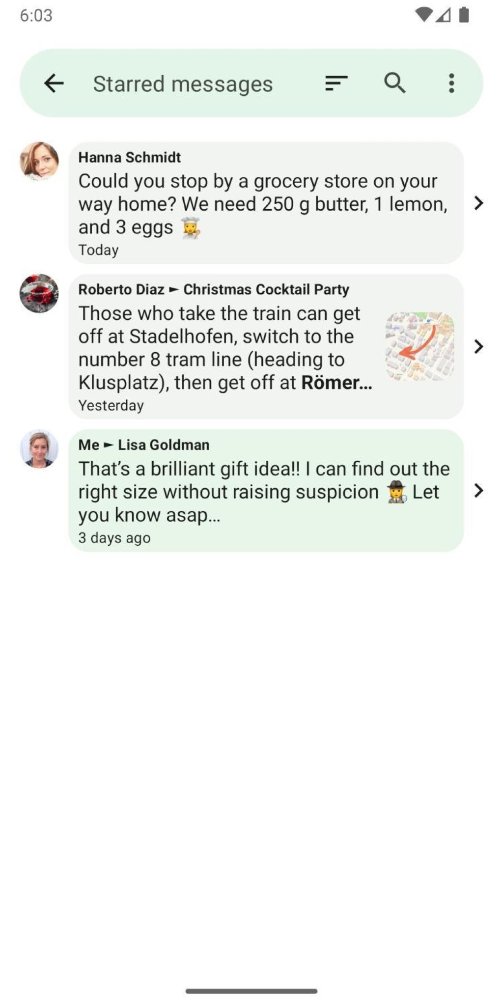 Starred messages are also useful to track open tasks or to highlight particularly memorable messages and extract them from the continuous stream of conversation.