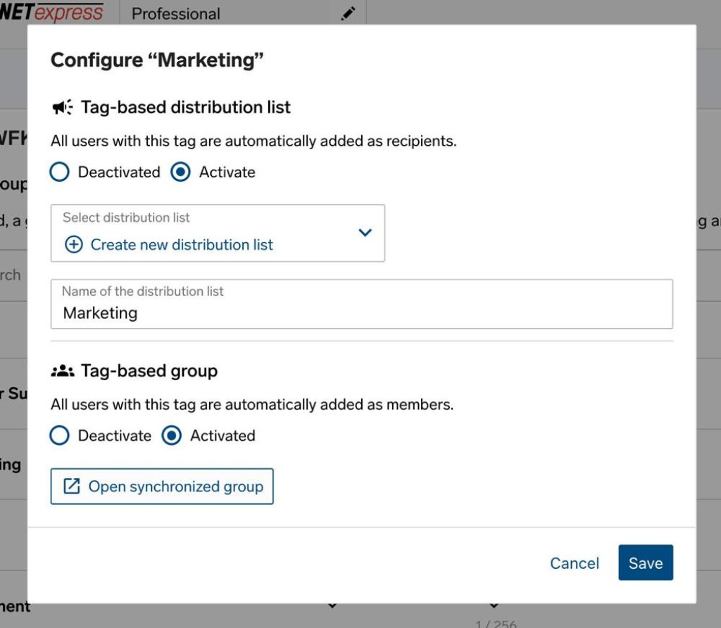 Use the settings icon to select the tag you want to use to create a distribution list or group, and click “Activate” to create the automated distribution list or group. You can then define whether you want to create a new distribution list or group or synchronize an existing one. You can also change the name of newly created distribution lists and groups.