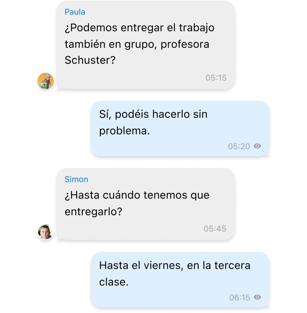 Encuestas para fijar citas, envío seguro de fotos, documentos o formularios, así como directrices claras sobre la disponibilidad fuera del horario lectivo